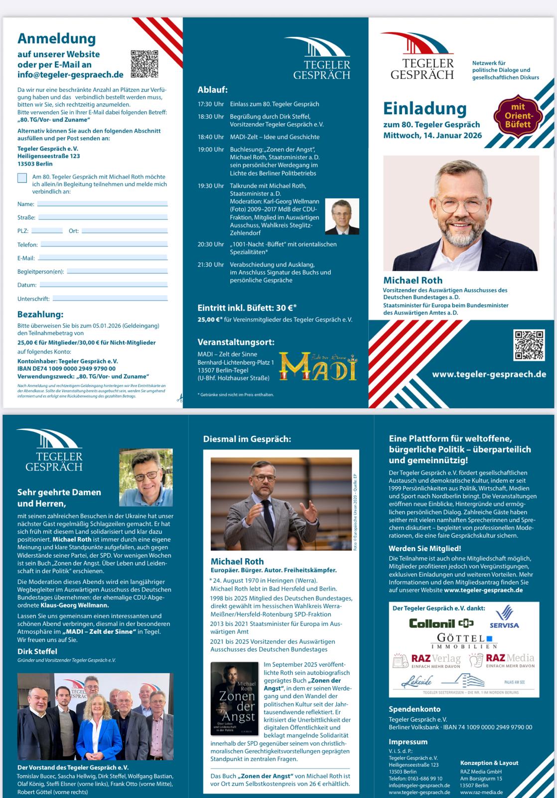 Zum Jahresauftakt 2026 begrüßen wir Michael Roth, ehem. Mitglied des Deutschen Bundestags, Vorsitzender a.D. des Auswärtigen Ausschusses und Staatsminister a.D. für Europa beim Bundesminister des Auswärtigen. Beim diesem Tegeler Gespräch sprechen wir mit dem SPD-Politiker über seine Außenpolitischen Erfahrungen sowie über “Leben und Leidenschaft in der Politik”, den Inhalt seines autobiographischen Buchs “Zonen der Angst”. Das Gespräch führt an diesem Abend Klaus-Georg Wellmann, ebenfalls ehem. Abgeordneter und “Wegbegleiter” im Auswärtigen Ausschuss des Deutschen Bundestags.