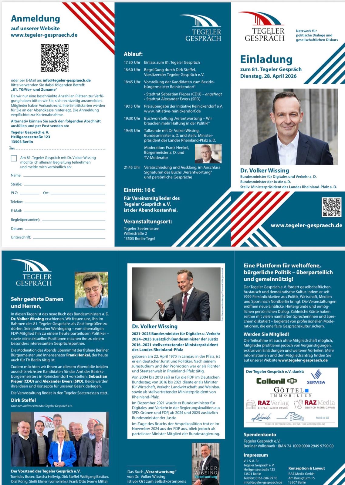 Sie erhalten als Mitglied des Tegeler Gespräch e.V. deutlich vergünstigte Eintrittpreise, Einladungen zu Mitgliedertreffen und -veranstaltungen. Die Gemeinnützigkeit des Vereins ist eingetragen.